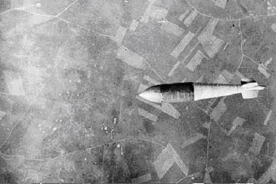 Este tipo de proyectil podía ser transportado por diversas clases de aviones bombarderos, y si se lanzaba desde una altitud de 6.000 metros, se clavaba en el terreno, después de caer libremente durante unos 40 segundos, produciendo al explosionar un cráter de unos 24 metros de diámetro, Si el objetivo era de los denominados “duros” (refugios de sumergibles o fábricas protegidas de combustible sintético con gruesos techos de hormigón), el poder de penetración se reducía hasta unos 2,5-3 metros. A la izquierda Bomba terremoto cayendo hacia su objetivo. Abajo, dos techos reforzados de hormigón, perforados por bombas terremoto. |