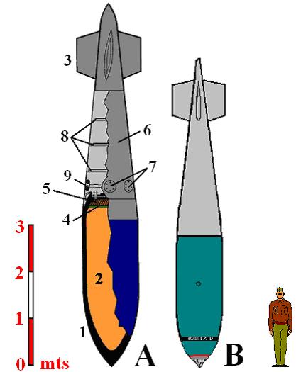 Comparación entre una bomba Grand Slam (A) y una Tallboy (B) y sus partes.