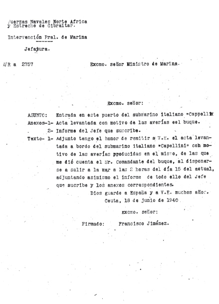 Respecto a su devenir histórico hemos de mencionar que fue puesto en grada el 25 de abril de 1938 en los astilleros de Odero Terni Orlando en La Spezia (Italia), botado el 14 de mayo de 1939 y entregado a la Armada italiana (Regia Marina) el 9 de agosto de 1939. El «Cappellini» era uno de los submarinos de la clase Marcello más modernos y se diferenciaba de los modelos precedentes solamente por la sustitución de los motores Diesel CRDA por motores Fiat italianos. Tras la entrada de Italia en la II Guerra Mundial, el 10 de junio de 1940 el submarino «Cappellini» es destinado al primer grupo en la 12.ª Escuadrilla con base en La Spezia (Italia) al mando del Capitán de Corbeta Cristiano Masi, viejo conocido, ya que al mando del submarino «Jantina» (clase Argonauta), perteneciente al 6.º Grupo de la isla de Lero, realizaría misiones de patrulla en aguas españolas durante la guerra civil. Al mando de su nuevo submarino zarparía desde el puerto de Cagliari (Italia) con destino a Madeira. Durante la noche del 14 de ese mismo mes, en las proximidades de Punta Almina (Ceuta), es avistado por el arrastrero inglés «Atlantic Ranger», consiguiendo eludirlo después de una rápida inmersión. En torno a las 00:30h de ese mismo día, cuando se aproximaba a Punta Almina (Ceuta), es avistado nuevamente por buques enemigos y tras él se lanza el torpedero inglés «HMS Vedette» (clase Admiralty V & W). Al avistar a otra nave enemiga, pone rumbo hacia aguas jurisdiccionales españolas, refugiándose en el puerto de Ceuta. |