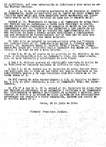 Como hemos apuntado en el epígrafe anterior, durante la madrugada del 15 de junio de 1940, el submarino italiano «Cappellini» solicita el permiso de las autoridades españolas para atracar en el puerto de Ceuta y ser debidamente reparado tras haber sufrido daños –de varia índole y trascendencia, como podremos comprobar a continuación– en el transcurso del ataque con cargas de profundidad por la Marina inglesa en la zona de Punta Almina. La primera referencia documental que poseemos, una carta informativa fechada el 15 de junio de 1940, fue redactada por Serafín Pérez –ingeniero naval– y remitida al Sr. Jefe de las Fuerzas Navales del Norte de África y el Estrecho de Gibraltar. En dicha misiva el ingeniero naval Pérez indica que, cumpliendo lo que se le ordenaba, a las 2:50 h se personó en el submarino «Cappellini» y comprobó, tras una somera inspección ocular, que este sufría la avería del timón vertical de popa –que se encontraba agarrotado y desnivelado–. Asimismo, el ingeniero naval afirma en este informe que necesitaría ir acompañado de un buzo para calibrar correctamente los daños que afectan al submarino italiano –este hecho se produce a las 9:45h del 15 de junio–. El buzo realiza un detenido reconocimiento y manifiesta que el buque «no presenta ninguna avería exteriormente», tras lo cual el ingeniero naval solicita que se le conceda una moratoria de quince días para desmontar las piezas del interior del buque, comprobar su estado y dejar al submarino en buenas condiciones para la navegación. Dos días después de que esta circunstancia se produjera en el puerto de Ceuta, el embajador británico envía una carta al Ministro de Asuntos Exteriores –el anteriormente mencionado Juan Beigbeder y Atienza– en la que se recogen las siguientes palabras: «Un submarino italiano fue atacado y dañado por un destructor británico el 12 de junio de 1940 a las 4:00h. El 14 de junio de 1940 a la 1:31h otro submarino –probablemente fuera el mismo– fue visto por otro de los destructores británicos en Punta Almina. Nuestro destructor estaba fuera de las aguas jurisdiccionales pero no hizo intentos de atacar, puesto que el submarino estaba dentro de las aguas territoriales. Esto no disuadió al submarino que lanzo un torpedo al destructor». A continuación, el embajador británico afirma tajantemente que un ataque llevado a cabo de semejante forma desde el interior de las aguas jurisdiccionales constituye una clara violación de las leyes internacionales. Finalmente, la Embajada de «Su Graciosa Majestad» solicita al Ministro español una respuesta a la pregunta de cuánto tiempo está dispuesto a permitir el Gobierno español que permanezca el submarino italiano en sus aguas jurisdiccionales. La emisión de esta carta provoca una serie de reacciones por parte del Gobierno español, entre las que se encuentra la redacción de un informe completo sobre el estado de la cuestión por parte de Francisco Jiménez, Jefe de las Fuerzas Navales del Norte de África y el Estrecho de Gibraltar. Dicho informe está fechado el 18 de junio de 1940 en Madrid y contiene los siguientes datos: «El 14 de junio de 1940 a las 2:00h entró en el puerto navegando en superficie y con sus luces de navegación encendidas el submarino «Cappellini ». Se personó ante las autoridades portuarias el capitán de corbeta Sr. Cristiano Masi, quien confirmó que se trataba del submarino «Cappellini» de la Marina de Guerra italiana y de muy reciente construcción. Declaró que procedía de Levante y que a 3,5 millas del Hacho fue rodeado por un crucero, dos destructores y dos buques ligeros, todos ellos ingleses, que le lanzaron cargas de profundidad. Al verse rodeado lanzó un torpedo y viró para tierra, metiéndose entonces en aguas españolas. No apreciaba avería alguna y pensaba salir antes de cumplir las 24 horas». Así fue, de hecho, en un primer momento, pero a las 2:50h el comandante manifiesta que al tratar de hacer la prueba definitiva para salir a la hora anunciada había encontrado una importante avería en el timón vertical de popa que le impedía salir. Como hemos referido con anterioridad, el ingeniero naval Serafín Pérez realizó una primera revisión y coincidió con el Capitán Masi en la necesidad de que un buzo termine de evaluar los daños (5). A las 9:00h dispuso el Ministro de Marina que se quedase el «Cappellini» amarrado al muelle de la escollera de Poniente, montando un servicio de vigilancia. A las 9:45h ordenó el reconocimiento por parte del buzo y el 17 de junio de 1940, a las 10:30h, según sus propias palabras, «puse a disposición del comandante italiano las máximas facilidades de personal y materiales». Este hecho se debió a que el ingeniero naval Serafín Pérez, tras personarse en el submarino, se ratificó en el plazo máximo de quince días para realizar las reparaciones. Una vez establecidos los plazos que, de forma aproximada, necesitaría el submarino italiano para reparar sus averías, el Gobierno británico, por medio de su embajador, comenzó a solicitar una información más detallada acerca de los motivos por los que permanecería el «Cappellini» en el puerto de Ceuta y también a recabar textos legales en los que se recogiera el estatus de los países que acogieran en sus puertos a los barcos implicados en la contienda mundial y a exigir a las autoridades españolas que se pronunciaran respecto a la situación de España en la II Guerra Mundial –recordemos que de ser un país neutral España pasó a considerarse «no beligerante»–. |