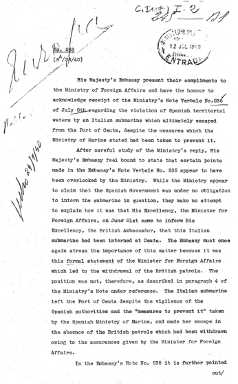 El 27 de junio de 1940 el Ministro de Marina remite un informe a la Embajada británica con la jurisprudencia existente sobre la invasión de aguas jurisdiccionales de países neutrales. De este modo, remitiéndose al artículo 14 del XIII Convenio de La Haya, recuerda a los súbditos británicos que «un buque de guerra beligerante no puede prolongar su estancia en un puerto neutral más tiempo del término legal, sino por causa de averías o por razón del estado del mar. Deberá salir en cuanto haya cesado la causa del retraso. Las reglas acerca de la limitación de la permanencia en los puertos, radas y aguas neutrales no se aplican a los buques de guerra afectos exclusivamente a una misión religiosa, científica o filantrópica». En estas circunstancias se encontraría el submarino italiano, según las palabras del Ministro, hasta el día en que «... abandonó el puerto burlando la vigilancia inglesa que con seis unidades se ha ejercido de una manera permanente alrededor de Punta Almina, siendo necesario en alguna ocasión indicarles por un patrullero español que salieran de las aguas jurisdiccionales». Resulta en cierto modo paradójico, máxime si conocemos las circunstancias en las que tuvo lugar el abandono –en la madrugada del 23 de junio de 1940– del puerto de Ceuta por parte del submarino italiano «Cappellini», que ningún patrullero británico avistara a la embarcación enemiga mientras dejaba atrás las aguas españolas. A las autoridades británicas tampoco se les pasó por alto este suceso y el embajador de Gran Bretaña se hizo eco de tales circunstancias en una dura misiva de la que haremos mención a continuación. Dieciséis días después de que comenzara el «caso Cappellini», la Embajada británica envía un informe «de carácter urgente» al Gobierno español para intentar esclarecer las causas que provocaron que el submarino italiano abandonara el puerto de Ceuta sin ser visto por los torpederos británicos. La carta, fechada en Madrid el 1 de julio de 1940, incluye los siguientes datos: «El 21 de junio de 1940 el Ministro de Asuntos Exteriores informó al embajador británico de que el gobierno español había acogido a un submarino italiano en Ceuta. El embajador supo que el submarino había escapado, «a pesar de las medidas que se tomaron para evitarlo», en la noche del 23 de junio de 1940. No hay razones para dudar de que este submarino es el mismo que el 12 de junio 1940 se refugió en aguas jurisdiccionales españolas para evitar el ataque de un destructor británico y, consecuentemente, el 14 de junio de 1940, desde esas seguras aguas, deliberadamente lanzó un torpedo en uno de nuestros destructores, el cual se encontraba fuera de esta agua, y se abstuvo de emprender acción o ataque alguno. Esta embajada va a emitir una protesta formal hacia el gobierno español en su contra, en especial contra el fracaso de las autoridades competentes para tomar las medidas necesarias para prevenir que se escapara este submarino. Ahora se nos informa de que el submarino sobrepasó el margen de 24 horas porque estaba averiado y se le dio un tiempo extra para reparar los daños. Esta embajada quiere puntualizar que es la obligación de un espacio neutral el informar a ambas partes acerca de las circunstancias que se dieron, si se concedió un tiempo extra y, si así fuera, de cuánto tiempo se trataba. Esta información nunca se nos ofreció. Cuando el Jefe Naval solicitó información al Ministro de la Marina, éste de forma persistente le dijo que debería dirigirse al Ministro de Asuntos Exteriores, pero era evidente que el Ministro de Asuntos Exteriores, que creía que el submarino había sido legalmente acogido, no había sido correctamente informado por el Ministro de la Marina. En este estado de cosas, la Embajada encuentra justificado realizar una serie de cuestiones en un memorándum adjunto, así como requerir a las autoridades españolas que nos comuniquen los pasos que dará en el futuro para prevenir la repetición de estos flagrantes abusos de las aguas jurisdiccionales españolas. La urgencia de este problema se plasma en el hecho de que los submarinos italianos están siendo diariamente atacados por los barcos de nuestro imperio (se cuentan alrededor de 12) y el peligro de posteriores incidentes debido a que los submarinos italianos intenten escapar es evidente. La Embajada está convencida de que es correcto admitir que esta acción disciplinaria se ha tomado contra las personas responsables de la huida de este submarino». Como hemos podido observar, el enfado de las autoridades británicas y su disconformidad respecto al proceder del Gobierno español es considerable. En respuesta a esta carta el Ministro de Asuntos Exteriores envía una misiva, fechada en Madrid el 8 de julio de 1940, al embajador británico para «defenderse» de las acusaciones de desinformación y malas actuaciones. En ella el Ministro hace referencia a las palabras del embajador –quien dice que el submarino abandonó el puerto «a pesar de la vigilancia inglesa que con 6 unidades se ha ejercido de una manera permanente alrededor de Punta Almina»– y se defiende afirmando que «no existe ninguna disposición legal que establezca una excepción para los submarinos en la aplicación de los artículos anteriores» y continúa argumentando que «el hecho de que España durante la Gran Guerra aceptara el internamiento de los submarinos, tampoco puede invocarse como precedente ya que se hizo sin adquirir ningún compromiso para el futuro respecto a esta apreciación del Derecho Internacional». Apela también a la jurisprudencia con el caso del «José Luis Díez», que estuvo en Gibraltar cinco meses reparándose de una avería. A continuación, el Ministro recuerda a las autoridades británicas que España no acepta el artículo 22 del Tratado Naval de Londres –con fecha 22 de agosto de 1930–, que establece que «los submarinos, en su acción con relación a los 