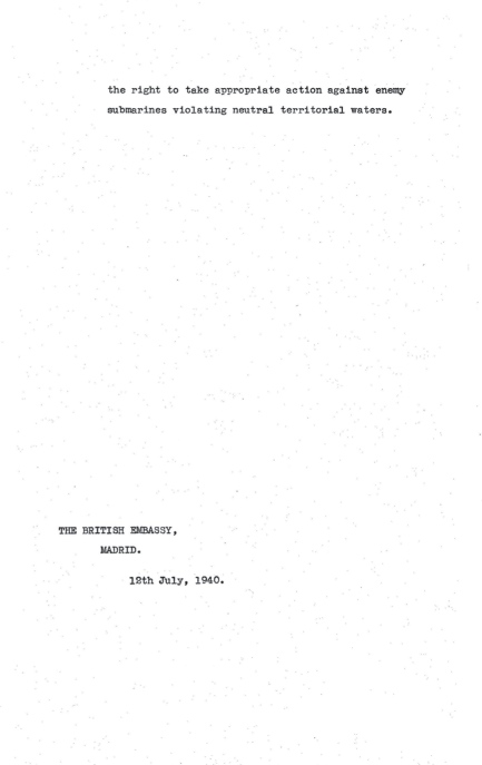 El documento que finaliza esta serie de informaciones sobre el incidente del submarino «Cappellini» –fechado en Madrid el 24 de julio de 1940– resulta un tanto contradictorio respecto a la posición real de España en este conflicto. Antes de recoger las palabras del Ministro de Asuntos Exteriores hemos de recordar que fue el propio Ministro quien se refirió –como hemos recogido anteriormente– al XIII Convenio de La Haya para establecer la jurisprudencia existente sobre el atraque de buques en puertos neutrales. Resultan, pues, contradictorias, las siguientes palabras del Ministro español, quien recuerda que «dicha Convención (La Haya) no ha sido suscrita por España y si se citan alguna de sus disposiciones es porque contienen obligaciones de los beligerantes pero salvando siempre aquellas que se refieren a los neutrales que, por no haber firmado España el Convenio, no pueden obligarle». Curiosamente, el Gobierno español termina diciendo que «desea evitar incidentes y salvar las cordiales relaciones existentes». |
