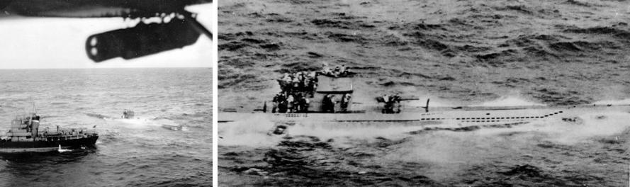 ![]() A la izquierda una trainera armada custodia al U-570. A la derecha la dotación en cubierta. |