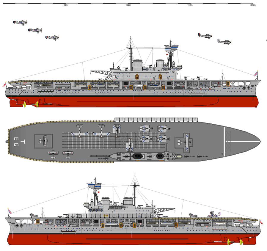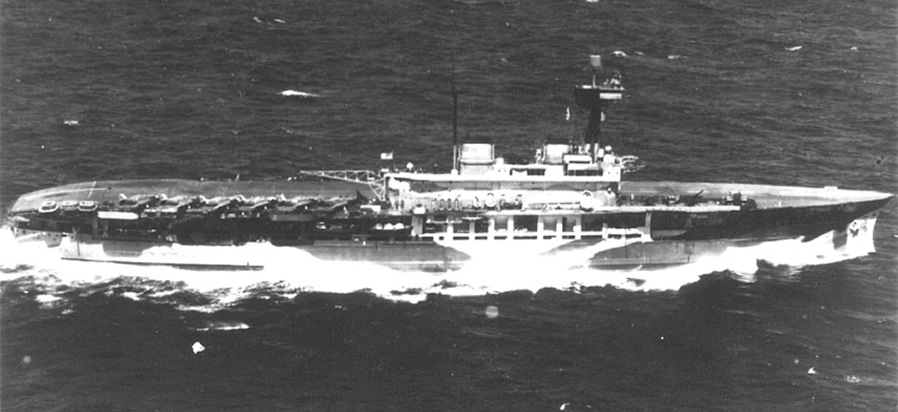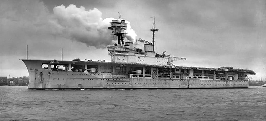 No sería hasta abril de 1920, que el “Eagle” estuviera a punto para las primeras pruebas del que sería el primer y auténtico “portaviones” del mundo. Las pruebas, que incluyeron 143 aterrizajes, establecerían las bases de lo que posteriormente se convertiría en el estándar en la construcción de portaviones: El HMS. Eagle pasaría la mayor parte del periodo de entre guerras de servicio en el extranjero. Inicialmente en el Mar Mediterráneo (1924-31), donde ofrecería un notable servicio a las víctimas del terremoto de Corinto en 1928, y en China (1933/35 y 1937/39). En la primavera de 1931 el HMS. Eagle y el destructor “Achates”, realizarían un largo crucero por aguas de Suramérica en apoyo a la “British Empire Trade Exhibition” (Exposición de comercio del Imperio Británico) de Buenos Aires. El HMS. Eagle sufriría varias actualizaciones, en 1926, 1929, 1931/2 y 1936. El estallido de la Segunda Guerra Mundial le sorprendería en Singapur, dónde tanto a él, como a un número de cruceros, serían asignados a la “Force I” en octubre de 1939 para dar caza a los buques mercantes corsarios alemanes. Esta misión hizo que el HMS. Eagle navegara más de 30.000 millas por el Océano Índico, que incluiría una breve estancia en Durban en diciembre de 1939. Los primeros meses de 1940, los pasaría escoltando a los transportes de tropas que navegaban por el índico, pero el 14 de marzo sufriría una explosión en la sala de bombas de proa (que causaría la muerte de 14 tripulantes, y que le obligaría a recalar en Singapur, donde estuvo realizando reparaciones hasta mayo). |