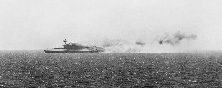 Podemos disculpar a Rosembaum por el uso de tantas exclamaciones en su KTB (las utiliza de forma habitual), ya que no hay muchos casos en la SGM en el que los cuatro torpedos lanzados a la vez por un uboot, impacten todos ellos en un buque de guerra. Por este motivo, el comandante de la escolta del convoy, el Vice-almirante E. N. Syfret declararía que no hacía falta crear un “Consejo de investigación” sobre el hundimiento del Eagle. Los cuatro torpedos, que al impactar produjeron “grandes explosiones secas” (heavy muffled explosions), alcanzaron al buque por la banda de babor, entre los cañones dos y tres. Los impactos estaban espaciados unos 12 metros entre ellos. El buque en pocos segundos quedaría condenado. Tras el primer impacto, el portaviones se escoraría cinco grados a babor, la escora aumentaría a quince grados tras el cuarto impacto y rápidamente alcanzaría los treinta grados. Tal era la escora, que los aviones “Hurricane” de la cubierta empezaron a deslizarse y a caer por la borda, y la tripulación intentaba desesperadamente encaramarse al casco. El Eagle se hundiría tan rápido, que solo se supo del alcance real de los daños a través de las entrevistas realizadas a los supervivientes. En estas declaraciones se indicaba que los mamparos de esa zona se colapsaron rápidamente, inundando completamente la sala de máquinas de babor y las salas de calderas “A”,”C” y “D”. Lamentablemente, ante la falta de supervivientes entre la dotación que la atendía, se dedujo que la sala de calderas “B” también había quedado inundada. La velocidad con la que entraba el agua, hizo imposible tomar medidas para contrarrestarla. El Eagle se hundiría en seis u ocho minutos, aunque en el KTB del U73, el Kptlt. Helmut Rosenbaum indicaba quince minutos. |