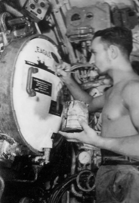 Un tripulante del U73 pintando la silueta del Eagle en uno de los tubos lanzatorpedos. |
