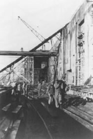 Se limpiaba la zona y se cavaba para colocar los cimientos y los grandes pilares de acero. Se extenderían barreras para evitar que el agua inundase la zona en la que se estaba excavando, ya que esta se encontraba por debajo del nivel del agua. Mientras, se extendería el suelo de hormigón en las zonas de los talleres y los refuerzos para las paredes se irían preparando para que, una vez estuvieran colocados, se pudiera verter el hormigón en ellos. Se estaría vertiendo hormigón para formar las paredes hasta que estas llegaran a la altura determinada. Entonces se colocarían las vigas prefabricadas sobre las que se irían colocando planchas que soportarían las capas de hormigón del techo. |