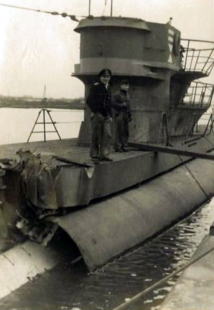 A la derecha vemos el estado en que quedó el U320 tras un accidente en su etapa de Ausbildungsboot. Los daños se producirían al colisionar con el buque "DWo 1" de la defensa portuaria local. El suceso ocurrió el 19 de enero de 1944 a la altura de Warnemünde (AO-7837). |