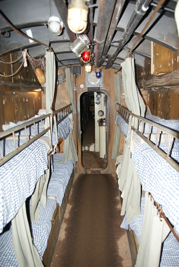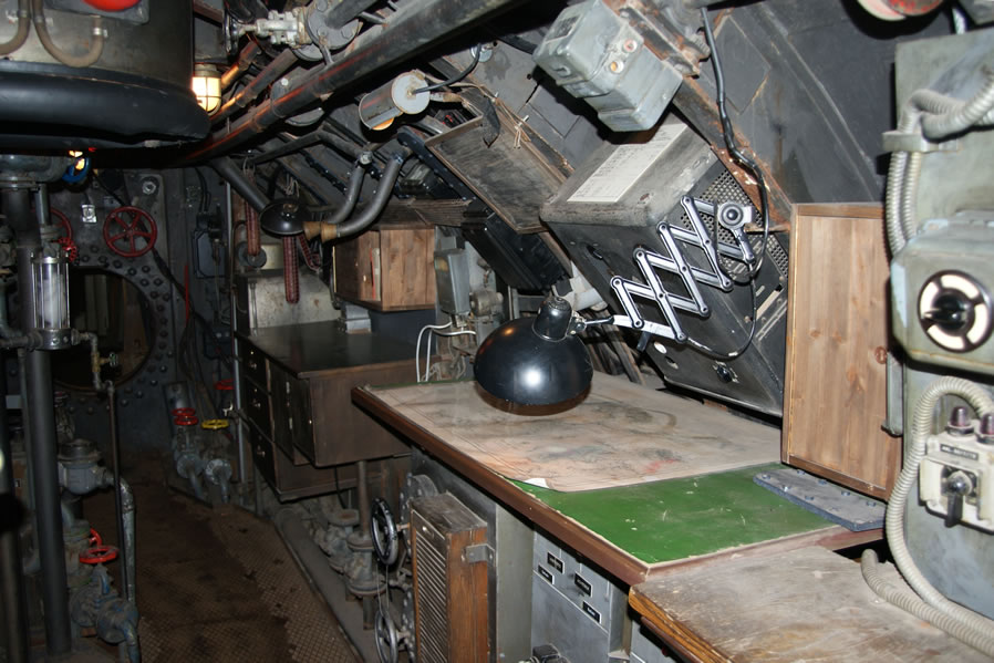 Para mi sorpresa, el grupo pasa a través del submarino como una exhalacion y enseguida me he quedado solo... paso la escotilla de la sala de torpedos y sigo avanzando: El lavabo... Maldición! alguien ha arrancado el letrero luminoso donde el orondo trasero rosa con una flecha anunciaba la función de la habitación. Un poco más adelante la zona de Oficiales. Los frios mamparos de metal tienen un revestimiento de madera que forma pequeñas separaciones para los catres. El techo está atestado de tuberías. En algunos lugares se puede ver el mamparo del casco de presión. Ah! la sala del hidrófono, y un poco más allá, más cerca de la escotilla que lleva a la sala de control, la sala de radio. Me doy la vuelta y ahí está el camastro donde Jurgen Prochnow le pedía al radio-sonarista que pusiera un disco... "...ya sabes cual".