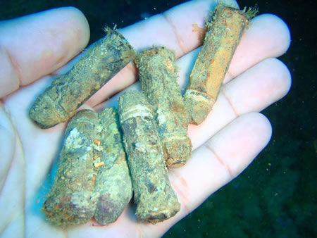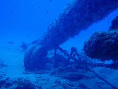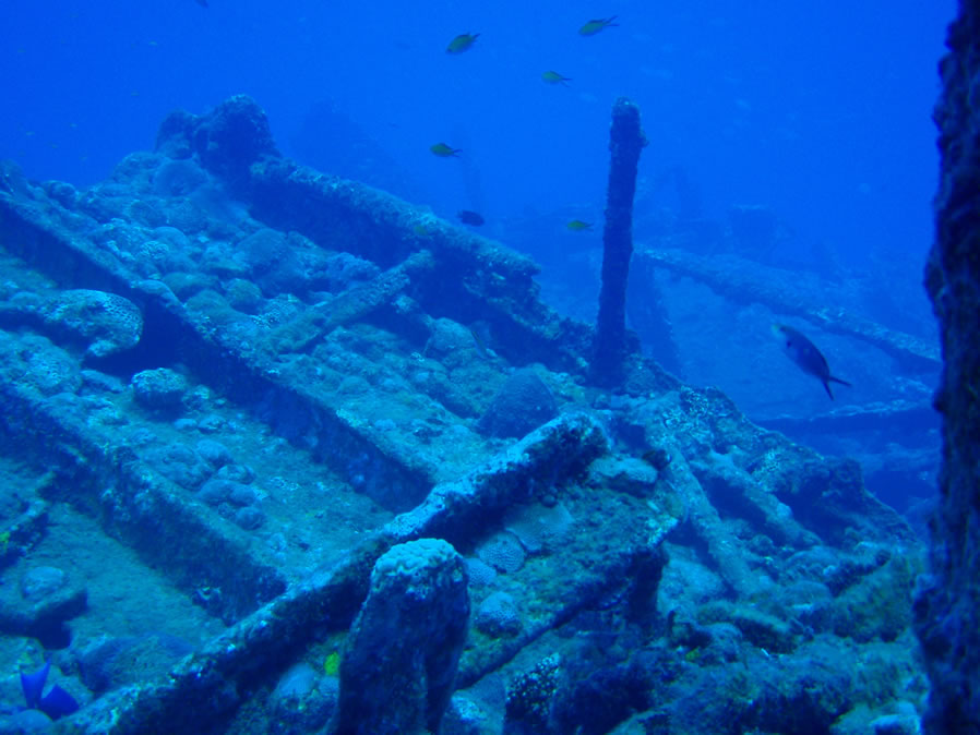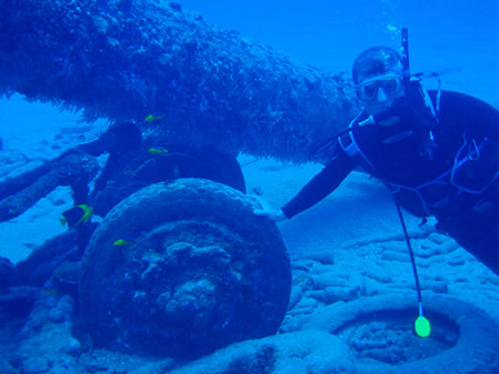 Había estudiado detalladamente el croquis del pecio realizado por Maurício Carvalho y que está colgado en www.naufragiosdobrasil.com.br. Me fue muy útil para la orientación. Un verdadero mapa de la mina. Como siempre, la segunda inmersión fue la mejor. Acercamos más nuestra embarcación al pecio, para economizar esfuerzo y aire. Descendí con Víctor, quien me iba a enseñar la estancia donde había encontrado una bañera y un retrete, a estribor de las calderas. Ciertamente allí estaban y la gente quería hacerse fotos dentro de la bañera o sentada en el retrete. Hicimos algunas fotos de este compartimento y todos pensaron que era el camarote del Capitán Antônio da Barra. Desconozco si el dato es correcto. Cerca había otro cuarto de baño, pero dado la vuelta. Lo que era suelo se convirtió en techo y el retrete estaba invertido. Más abajo, acostado sobre el fondo de arena, estaba el mástil y, debajo del, un eje, cigüeñal, ruedas y restos del chasis de uno de los camiones. ¿Sería de éste del que saltó la rueda que mató al primer piloto? Nadamos hacia popa. Wagner encuentra en la arena, cerca del segundo mástil, centenares, tal vez millares, de cartuchos .44 WCF CBC. Típica munición de las carabinas Winchester modelos 1873 y 1892, que por aquel entonces era un arma muy común en las regiones Norte y Noroeste de Brasil. Muy raro, ya que no se dice nada en documento alguno. Quizás un pedido de algún gran almacén de Belem o de las plantaciones de caucho a la Compnahia Brasileira de Cartuchos. Me dijo después, ya en superficie, que también había encontrado proyectiles de artillería. Pensé que los habría confundido con objetos parecidos y no le di mucha importancia. Más botellas de cerveza y neumáticos por la arena. También restos del segundo mástil y uno de los pescantes de estribor que bajaron los dos únicos botes. Allí está la forma redondeada de la aleta de babor, con parte de la barandilla. Una preciosa curva que aún conserva su elegancia, a pesar de todo. No vi ninguna de las dos hélices, tal vez robadas por saqueadores. Es posible penetrar en la popa, pero no lo hago, pues habíamos planeado estar 15 minutos en el fondo y ya es hora de volver. Regreso a través de un campo de restos, escoltado por un banco de jureles. ¿Pueden dos torpedos provocar semejante daño, o alguien dinamitó el centro del buque hace un tiempo? ¿saqueadores a la caza de alguna cosa de valor? Allí está nuestro cabo para ascender y los buzos se reúnen en las cercanías. Viniendo de varias partes del naufragio, convergen en nuestro punto de reunión. Es posible ver las nubes de burbujas blancas que se acercan, contrastando con aquella inmensidad azul. Allí cerca están los dos motores diesel, perfectamente visibles. Están paralelos y tienen más de cinco metros de altura. Al lado observo una gran caldera. Poseído por un irresistible deseo, nado hasta los motores y atravieso lentamente un pasillo de ocho metros formado entre ambos. Sigo a una barracuda plateada que va delante, manteniendo una distancia constante. El pez brilla en este mundo opaco y silencioso. ¡Inolvidable sensación! Es, tal vez, el mejor momento de mi modesta vida de buceador. Sin gravedad y sin ruido, solamente el sonido de mi respiración y el murmullo de las burbujas que salen de mi regulador de aire. Lentamente, disfrutando de un momento de rara belleza, equilibrio y paz como jamás sintiera hasta entonces. Soy presa de una enorme emoción de la que me siento absolutamente incapaz de describir en estas líneas. Pero es hora de volver, una lástima. Salgo por el otro lado y nado en dirección al cabo que está amarrado a una enorme viga. Mi escolta se compone ahora de solo dos jureles. Allí está Joyce, la otra guía del grupo, enseñándome el reloj y señalando con el pulgar hacia arriba. ¡Subir! |