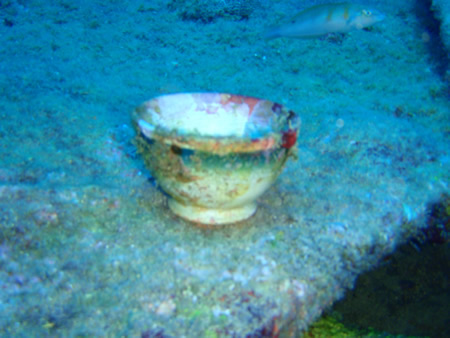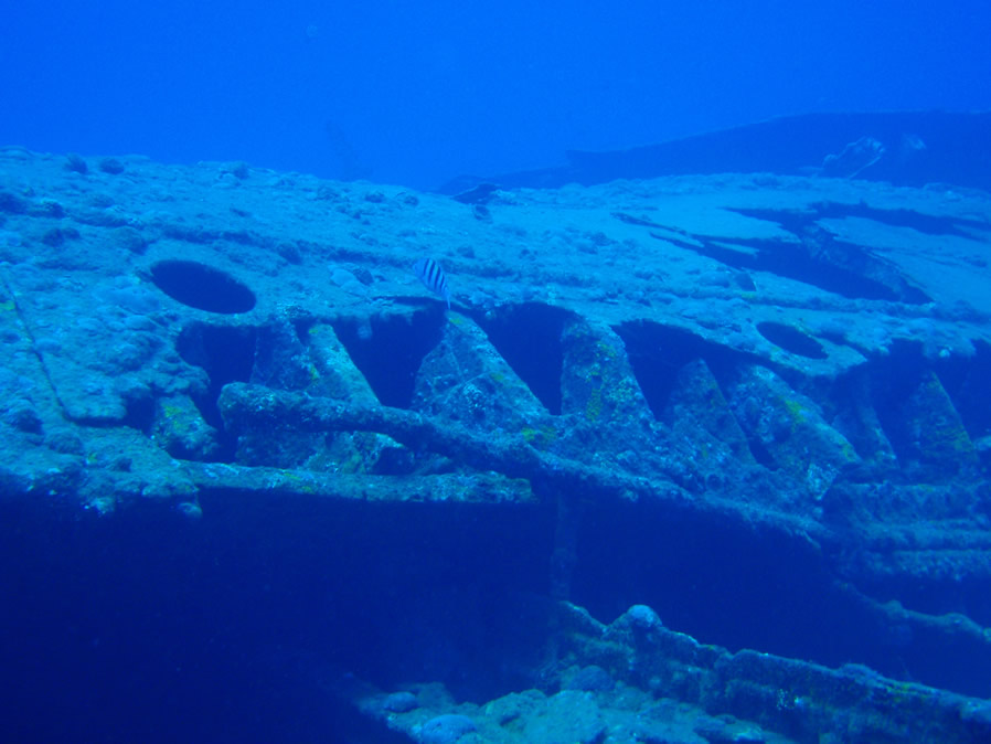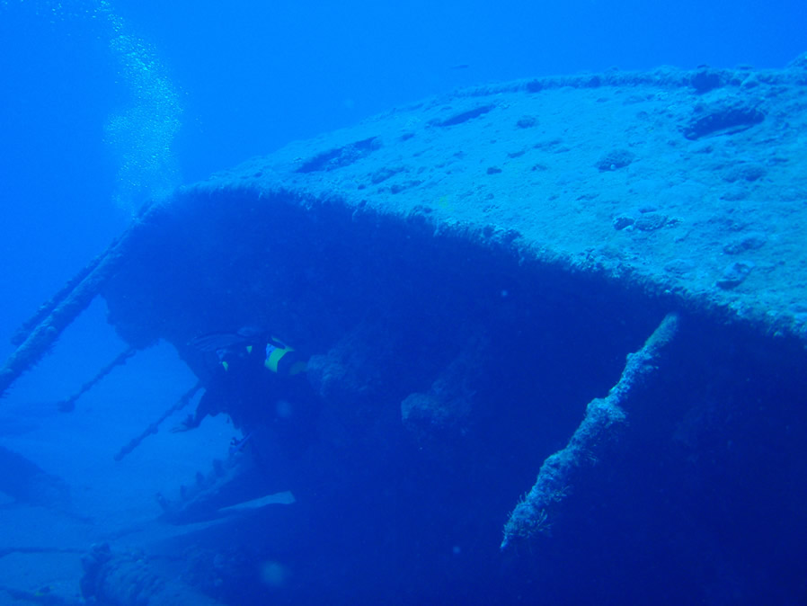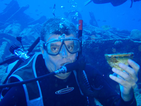 Llegamos al naufragio. No sé cómo pueden acertar con el sitio en medio del basto océano. Estamos a casi ocho millas de costa, casi en la perpendicular de Lagoa Azeda. ¿Cómo son capaces? La línea de costa es visible y tal vez usen algún proceso de marcación por enfilaciones, alineando dos elevaciones y la coincidencia de una torre con una grieta en el acantilado, o algo parecido. Tal vez encontrar así una zona no sea muy difícil, pero localizar un punto requiere mucha habilidad. Desde la borda del barco podemos atisbar la sombra marrón del Itapagé, allá en el fondo. Luego, Claudionor, uno de los buzos que nos guiará, expone un resumen de la inmersión. Descenderíamos todos juntos, formando un solo grupo. ¡A equiparse! Se lanza un cabo con peso atado en medio del naufragio, para descender por él. Wagner comentó a los buceadores que se equiparan en el agua, es decir, que se pusieran el conjunto chaleco/botella/latiguillos flotando en el mar, ya que así pesa mucho menos y se coloca mejor. No quise arriesgarme, por que noté que había algo de corriente, y me eché al mar ya equipado e, inmediatamente, fui arrastrado a popa, agarrándome como un mono al tag line.Nos sumergimos y en seguida vi el Itapagé. ¡Fantástica imagen! Valió la pena todo el sufrimiento hasta aquí. El agua está caliente, la corriente disminuía con la profundidad y la visibilidad alcanzaba los 30 metros. El buque es enorme y reposa sobre un fondo plano de arena blanca, está lleno de marcas de líneas cebreadas, unas claras y otras oscuras. Un marco agradable. Bancos de barracudas, jureles y bonitos desfilan en varias direcciones ajenos a nuestra presencia. El pecio está escorado a estribor, partido a la altura de la primera bodega y sobre la arena hay centenares de botellas de cerveza. Aparecen también muchos neumáticos. Es como volver al pasado, donde todo es oscuro, silencioso y azulado, impresionante. Como siempre miro mis instrumentos: Estamos a 27 metros de profundidad y la temperatura es de 28ºC. Dos enormes tortugas nadan un poco más arriba, curioseando. Wagner está conmigo y nadamos hacia la proa. Estoy exultante y emocionado con la inmersión, mi flotabilidad es perfecta y respiro tranquilamente, disfrutando cada momento, cada imagen. Llegamos a la proa, que está entera y es gigantesca, con aquella característica forma recta de los buques proyectados en el periodo de entreguerras. Inolvidable. Las anclas no están por allí y hacemos una curva por la roda de proa. En la arena hay una delicada taza de porcelana y un pequeño frasco de perfume, imagen surrealista en medio de toda aquella destrucción. Después es un plato el que yace al lado de una chapa de dos pulgadas de acero que fue retorcida por fuerzas catastróficas. ¿Cómo pueden sobrevivir objetos tan frágiles al brutal poder de un torpedo? |