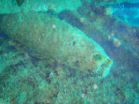 Busqué la tumba del tripulante Domingos Silva Santos en el cementerio de Nossa Senhora da Piedade. Era el mozo de cubierta del Itapagé y resulto gravemente herido en el ataque, falleciendo en el Hospital de Santa Casa de Maceió al día siguiente. Los periódicos de la época informaban del entierro de este hombre, con gran asistencia de gente, en ese mismo lugar. No encontré nada. Al pasar por delante de un albergue en Praia do Francês, vi en la entrada un proyectil de artillería lleno de herrumbre. A primera vista, para mi incontenida alegría, parecía un proyectil de 105 mm del cañón de un Uboot del Tipo IX. Hablé con el propietario, que era un antiguo y experimentado buceador. Me contó entonces que había recogido el artefacto a finales de los años 70, en el fondo del mar, cerca de la playa. Faltaba la espoleta de la granada, pero las huellas del disparo estaban allí, marcadas por las estrías del cañón. Detalle que indicaba que el artilugio había sido disparado. Pedí entonces una regla y enseguida constaté que el calibre era mayor del 105 mm. Bien, tal vez sea el de 127 mm del cañón estándar de la US Navy. Tampoco. Para mi decepción, la regla indicó un tamaño aproximado de 140 mm, algo bastante extraño(14) ¡Vaya cosa! |
