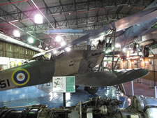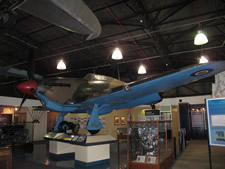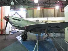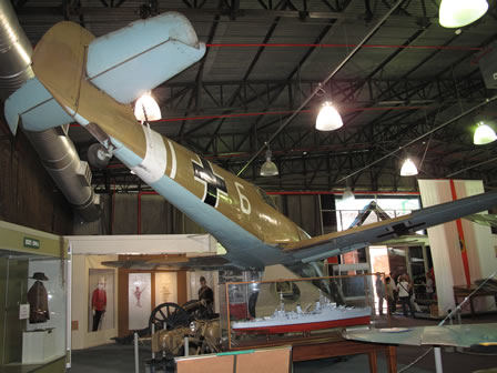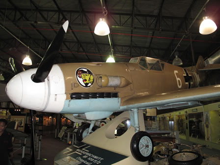 En la nave siguiente y rodeada de diversas vitrinas con uniformes, condecoraciones, armas, libros, fotografías… encontramos el Bf-109F/2 tropic de JG/27 acompañado de algunos de sus más enconados enemigos: un Spifire, un Hurricane así como un Mosquito. |