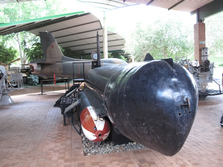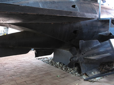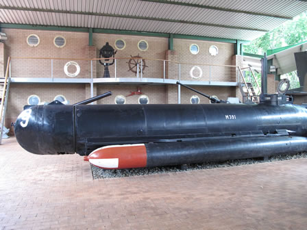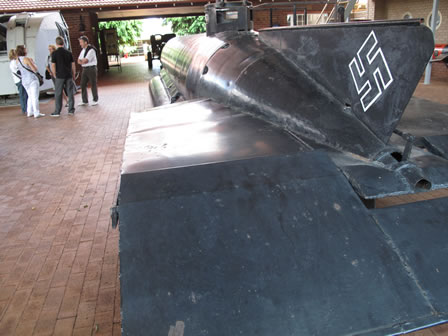 | Una vez visitadas las tres naves repletas de piezas en un magnifico estado uno pasa a visitar el jardín y es allí donde se encuentra expuesto el submarino Molch acompañado de otras piezas navales así como carros de combate, aviones de combate, transporte y piezas de artillería todo bajo cubierto y presentando un magnifico estado de conservación. |