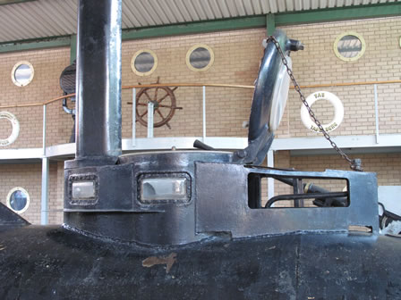 El mini submarino es la primera pieza que se observa antes de traspasar el umbral que lleva al jardín estado situado en una posición central que facilita su observación desde todos los ángulos, tiene adosada una escalera que permite llegar hasta la escotilla que se encuentra abierta, aunque sellada por un grueso metraquilato que impide el acceso. |