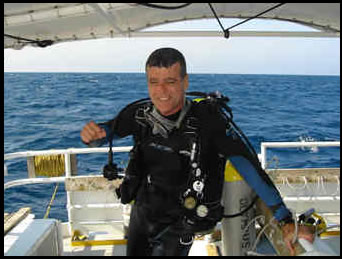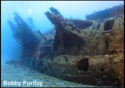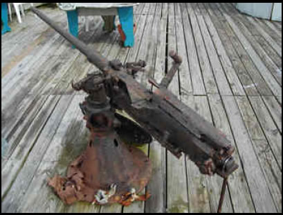 El cañón no está, posiblemente fue arrancado por las cargas de profundidad y hasta ahora no ha sido localizado por los submarinistas. En 1980 bastantes proyectiless de 88 mm., torpedos, cargas de profundidad y distintos objetos fueron recogidos de la arena por submarinistas de la U.S. Navy. Sin embargo aún existen tres torpedos a bordo. Existen muchos erizos engarzados en el acero oxidado pero casi ninguna anémona, esponja o coral. ¡Que cosa! Un golpe en el tubo del mi panel de instrumentos, un susto y enseguida vuelvo a la realidad. Es Steve, mi atento compañero. ¡La aguja del manómetro ya está en rojo y ya es hora de subir, que pena, una aventura inolvidable! |