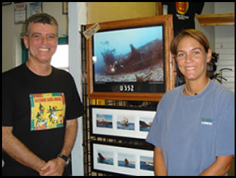 George Purifoy descubrió el U-352 en 1975. George es el propietario del Olympus Dive Center, empresa que tiene su sede en la ciudad de Morehead, y lleva regularmente grupos de submarinistas a los más interesantes naufragios de la región. En la empresa existe un pequeño museo con muchos objetos reunidos por el Sr. Purifoy durante años de buceo en el pecio del U-352, incluso un cañón AA de 20 mm. y una escotilla, los dos en exposición en su empresa. Olympus tiene disponible un cómodo alojamiento para submarinistas así como dos grandes barcos operativos dotados con excelente infraestructura. Uno de estos barcos, el "Midnight Express", es un buque con 48 pies, en el que navegamos hasta el lugar del naufragio de U-352, situado alrededor de 25 millas al sur del cabo Lookout. |