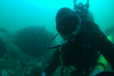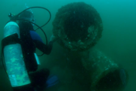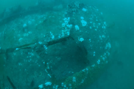 Todo él es muy fino. Un objeto capaz de cortar la línea del agua de forma bastante discreta. Busqué en vano la ametralladora antiaérea de la torreta, de calibre 20 mm, situada en la parte posterior de la misma en una plataforma conocida como el “wintergarten” (jardín de invierno). En 1942 buceadores de la US.Navy desmontaron la ametralladora y a finales de los 80 desapareció misteriosamente un torpedo, que aún se encontraba en el interior del tubo lanzatorpedos de popa. El periscópio de observación también ha desaparecido. El largo casco reposa en un fondo de arena, inclinado aproximadamente 45 grados al noreste. Nadamos lentamente, encantados por la falta de gravedad hacia el cañón de cubierta. Imaginaba que sería más grande. El tubo del cañón apunta agónicamente hacia la superficie, con un ángulo de unos 60 grados y se pueden observar perfectamente los mecanismos de elevación del mismo. Pensé en los marineros ametrallados mientras intentaban cargarlo. Es escalofriante, tanto que ni notaba el agua helada que empezaba a penetrar mi traje de 5 mm. ¡Dios mío, se destila historia por todos lados! Nadamos un poco más y llegamos a la zona de proa. Allí están los cuatro tubos lanzatorpedos, realmente sus formas son siniestras. El tubo inferior derecho, junto a la arena, se encuentra en excelentes condiciones. |
