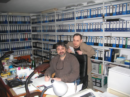 Horst tiene su propio despacho, aunque por lo que vimos, la mayor actividad se debe centrar en la sala con los archivos. En dicha sala ocurrió una anécdota muy simpática: Horst nos pidió que en un folio escribiéramos unas palabras y quienes éramos. Este papel formaría parte del libro de visitas del archivo. Tras hacerlo, Horst nos hizo una foto con su cámara digital. Tras comprobar que la foto había quedado bien, en el papel donde habíamos firmado, dibujo las siluetas de los que aparecíamos en la foto y tras preguntarnos, escribió los nombres de los que apareceríamos en ella. Nos dijo que una vez revelada la foto la pegaría allí y pondría los nombres. ¡Curioso pero eficaz método!. Tras despedirnos salimos por la puerta del museo con una sonrisa amplia, muy amplia. Aprovechamos para agradecer a Horst Bredow, su mujer Annemarie y a Jak Mallmann Showell su amable acogida y magnifica ayuda. |