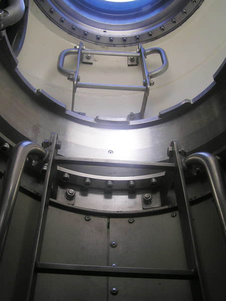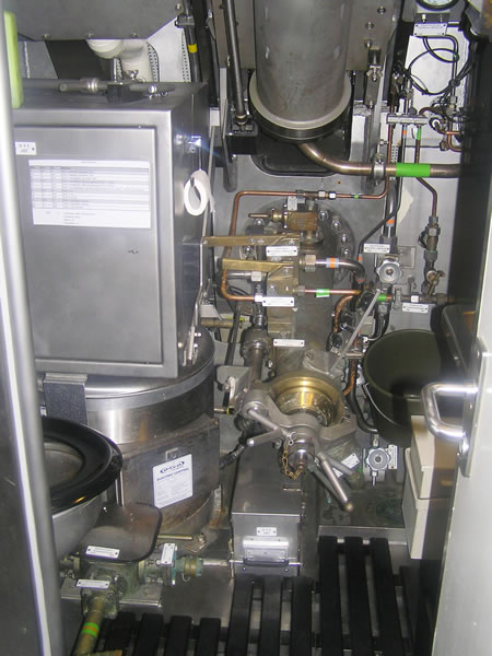 Seguimos nuestra visita, accediendo por fin a los compartimentos que contienen la parte mecánica del submarino. El sistema de propulsión de la clase 212-A es doble, formado por uno convencional dotado de motor y generador diesel con baterías, así como otro denominado AIP (Air-Independent Propulsión) o Sistema de Propulsión Independiente, utilizado para la navegación silenciosa a velocidad de crucero, que funciona a base de combinar oxígeno e hidrógeno en una pila dotada de 9 membranas de electrolito de polímero (PEM). |