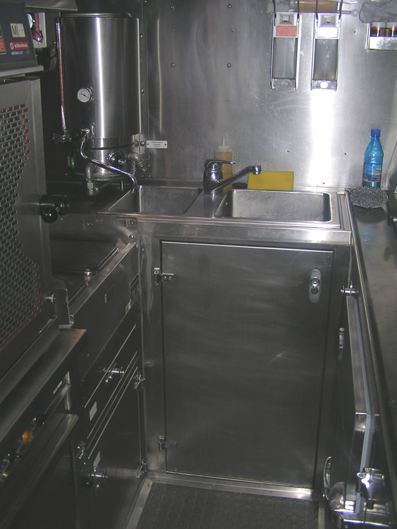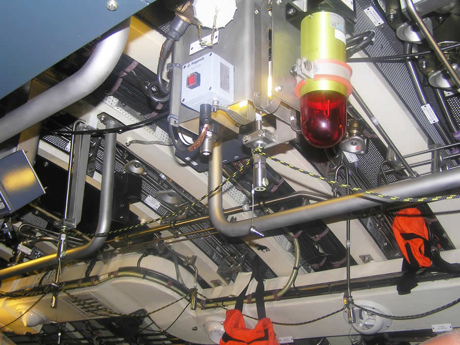 La luz ambiental es muy agradable y permite leer sin ningún tipo de dificultad. El comandante nos explica que dentro del submarino, no existe la famosa luz roja que se suele ver en todas las películas de sumergibles. El grado de informatización de los submarinos de la serie 212-A, y por tanto del U34 es muy alto, tanto, que el propio comandante, al que entregué como regalo un CD de música, nos comunicó que estaba totalmente prohibido introducir en la nave material informático, salvo el autorizado por el mando. Era una manera drástica de evitar problemas con el software extraño, que pudiese llegar a inutilizar los sistemas de control y seguridad del submarino, poniendo en peligro la vida de la dotación. |