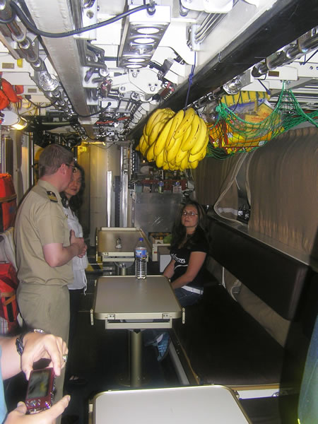 Una nueva puerta se abre en la banda de estribor, pero un cartel rojo indica prohibido el paso. Supongo que contendrá los sistemas de escucha y transmisiones, la parte sensible del submarino, así que como no podemos entrar, continuamos con la visita. Ahora descendemos a la cubierta inferior a través de una escotilla cuadrada. Me llama la atención que este submarino no tenga puertas estancas como los sumergibles clásicos, aunque supongo que será debido al alto grado de seguridad que le han asignado sus diseñadores y constructores. |