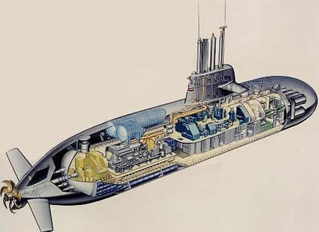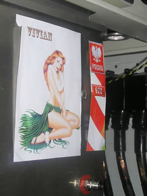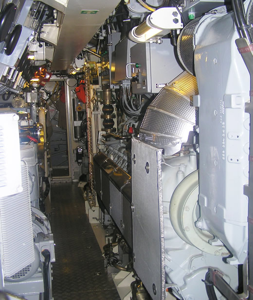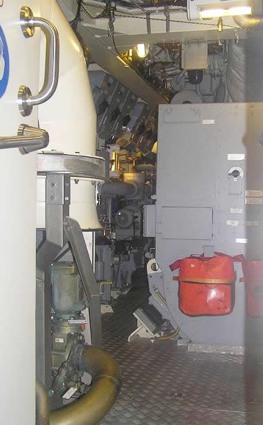 Me impresionó la excelente limpieza que presentaba el interior de la sala de motores, nada comparable a la antigua “lavandería china” de los clásicos tipo VII, siempre rodeada de vapores, manchas de aceite o combustible. Me entretengo en curiosear algunas manivelas y válvulas. Cuando cruzamos por un angosto pasillo, veo en la pared el dibujo de una chica que me llama la atención. El comandante me explica, entre risas, que se trata de un marino que allí trabaja, con orígenes polacos (por eso está allí el escudo de Polonia) y que tiene a “Vivian” (así se llama la chica) como amuleto. Continuamos visitando el sistema de propulsión, con los enormes motores térmicos, que dotaban a la unidad, los sistemas de dirección y el eje de la hélice, ya en la parte de popa del casco resistente. El comandante nos explicó que, pese al alto grado de automatismo y digitalización de la nave, existe un sistema manual de emergencias, que sería empleado para dirigir manualmente el submarino si todos los sistemas anteriores fallasen. |