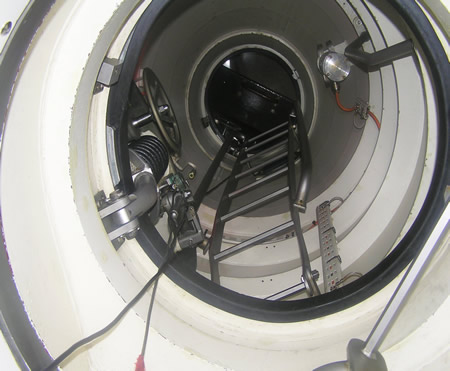 Me llamó la atención una serie de bolsas naranjas situadas frente a cada puesto. Miro con curiosidad el rótulo que hay en cada una de ellas “RETTUNGSANZUG U-BOOT-BESATZUNG BUND”. Enseguida comprendo de lo que se trata. Son los equipos autónomos de respiración. El Capitán de Corbeta se da cuenta de mi interés y me explica su funcionamiento, mientras en mi mente imaginaba los sistemas de rescate de los años 40 (el famoso equipo Tauchretter). Le pregunto por el sistema de evacuación en caso de inundación y me conduce a la esclusa de emergencia. |