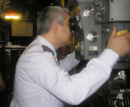 Deseo hacer algunas fotografías, y así se lo hago saber a Klaus, que hace de intérprete entre el comandante y yo. El comandante de explica que al ser el U34 la unidad de combate más moderna del mundo, está dotado de dispositivos de última generación, por tanto la fotografía estará restringida a las zonas comunes, y siempre previo permiso. Era de suponer, así que solicito permiso para realizar las primeras imágenes. No puedo resistir la tentación y miro por el periscopio de observación. La calidad de la imagen que me devuelven las lentes es asombrosa. El propio comandante me informa que existe un sistema para poder grabar a través del periscopio, así como para fotografiar el perfil del buque, y que un sistema automático de detección de perfiles se encarga de determinar la clase de buque a la que pertenece (un adelanto comparado con los antiguos libros de perfiles de buques de guerra). Según la información que he podido obtener de la red, las unidades de la clase 212-A están dotados de dos periscopios Zeiss Optronic. |