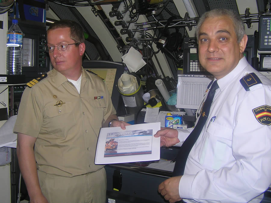 El comandante no tiene más que palabras de asombro al ver la calidad de nuestro proyecto, y me dice que para ser aficionados a la historia submarina, nuestra página está muy bien trabajada. Le agradezco igualmente sus palabras y le hago entrega oficialmente del libro así como de un CD con los temas musicales que ambientan nuestra página. Tras el intercambio de regalos, llega la hora de abandonar el submarino. Ascendemos a la cubierta y salimos por la escotilla de proa. Ya en cubierta no podemos despedirnos sin hacer algunas fotos más en grupo. |