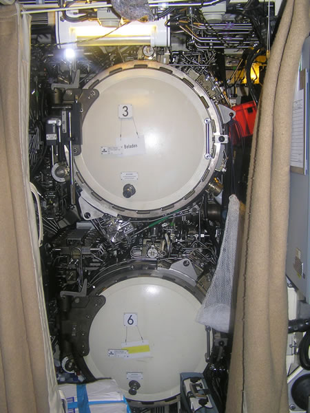En el nivel inferior se encuentra la sala de torpedos propiamente dicha. No excesivamente amplia, aunque sirve igualmente como comedor y lugar de descanso con 3 mesas plegables con sus respectivos bancos. Tras los respaldos de los bancos, y ocultos por unas telas se encuentran los torpedos de repuesto que pueden ser recargados, si fuese el caso, desplazando los muebles removibles. Me llama la atención ver sobre las mesas unas redes conteniendo diversos géneros alimenticios; zumos, fruta, café o galletas, al igual que en sus antecesores de las clases VII ó IX. El comandante nos explica que en un submarino cada espacio libre debe ser ocupado con provisiones. Enfrente de los torpedos se abre un pequeño camarote destinado a ser comedor y sala de recreo de los oficiales. Por fin llegamos a la proa. Allí están los 6 tubos lanzatorpedos del submarino, con sus relucientes portillas pintadas en color blanco y un número que los identifica. Uno de los tubos lleva colgado un cartelito con la inscripción “Beladen”. Señalo el mismo y el comandante nos dice que significa que el tubo contiene un torpedo. Otro pequeño servicio dotado de WC y ducha facilita la vida a los tripulantes. |