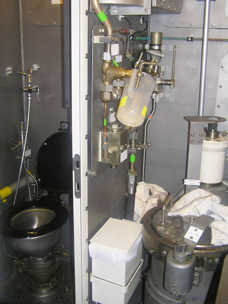 Tras algunos minutos más comentando los sistemas de respiración autónomos existentes en la unidad, el comandante decide continuar con la visita. En ese mismo nivel se encuentra un servicio, dotado de WC y ducha, así como de un sistema que conozco de mis estudios sobre el XXI. Como veo que ya casi nos marchamos me dirijo al Capitán de Corbeta y mientras señalo con el dedo le pregunto ¿Bold...?. El comandante sonríe y asiente con la cabeza. Efectivamente, comenta la utilidad del lanzador de señuelos, que conozco a la perfección, y me habla un poco de su funcionamiento. |