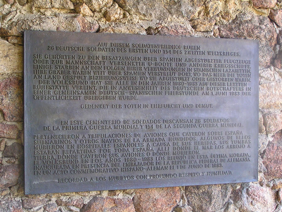 Un camino de tierra nos conduce hacia el único edificio del recinto, un pequeño porche con unas escaleras de bajada al camposanto, dotado de un espartano banco, un par de columnas y la placa en alemán y castellano que nos recuerda que en ese lugar se encuentran enterrados los restos mortales de 26 soldados y marineros de la 1 Guerra Mundial, así como 154 de la Segunda. |