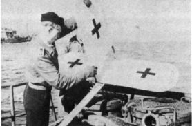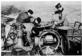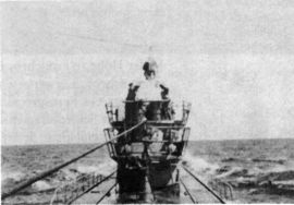 El mayor defecto que presentaban los sumergibles en mar abierto y en superficie, era su poco radio de visibilidad. La torreta o vela apenas levantaba algunos metros sobre el nivel del océano, sirviendo por tanto de poco al ser empleada como observatorio. Con el fin de elevar el horizonte de observación, algunos comandantes optaban por “atar” literalmente a alguno de sus mejores -y más ligeros- vigías al tubo del periscopio, que era izado aumentando así el campo de visión, con la esperanza de localizar un blanco entre las azules aguas del océano. Este sistema, además de ser poco recomendado para el periscopio (una de las piezas más sensibles al trato brusco de cuantas transportaba un sumergible), tenía sus detractores al pensar que en un momento de riesgo, ante la presencia de aviones enemigos, podía retrasarse la inmersión poniendo en peligro la integridad de la unidad. Posteriormente se diseñó un sistema de mástil, sujeto por vientos metálicos y una pequeña plataforma en su parte superior (de unos 8 metros de longitud), que elevaba el campo de visión unos cuantos metros sobre el nivel de la torreta, aunque insuficiente aún para obtener resultados exitosos y bastante engorrosa a la hora de efectuar una inmersión de emergencia. |