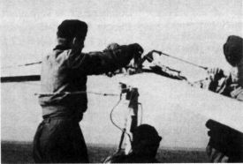 El sistema de vuelo era muy simple. Se montaba la cometa, se subía el observador-piloto en su asiento, se ataba el arnés de seguridad, el sumergible ponía proa al viento y se iniciaba el giro de las aspas mediante una cuerda que actuaba sobre la polea, o ayudándole con las manos, posiblemente la operación más habitual. |