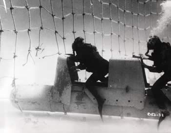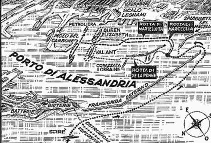 De la Penne y Bianchi comprobaron que su “maiale” funcionaba a la perfección. Pocos minutos después de abandonar el submarino, el comandante de los incursores decidió subir con su torpedo a la superficie para comprobar su navegación. Marceglia y Martellotta a parecieron con sus “cerdos” a poca distancia del torpedo tripulado por De la Penne. Hasta el momento, el ataque se desarrollaba dentro del horario previsto. Flotando comodamente a lomos de sus “Maiale” y solos en alta mar, los torpedos humanos abrieron sus raciones alimenticias y esperaron, contemplando las distantes luces del puerto y especulando sobre los peligros que aún podrian salir a su paso. Una hora después se pusieron en marcha hacia las luces, sacando tan solo sus cabezas fuera del agua. De nuevo tuvieron que detenerse, pero entonces no cambiaron palabra alguna. Se oian con toda claridad voces egipcias en el muelle comercial. De pronto hizo su aparición una enorme lancha motora provista de un reflector. De acuerdo con lo previsto, los hombres-torpedos se sumergieron en el acto y se acercaron a toda velocidad al muelle. Pequeñas cargas de profundidad empezaron a caer en el agua, lanzadas por la lejana lancha. Los tres “cerdos” se reunieron bajo el agua, junto al espigón del muelle, y cada hombre se preguntó si la incursión había sido descubierta. Las cargas de profundidad cayeron más cerca y las ondas expansivas lanzaron a los seis hombres contra los cimientos del muelle. La motora se aproximó más y una carga final estalló a cincuenta metros de distancia. La explosión les hizo el efecto de recibir un gigantesco puñetazo. Después, la lancha se alejó A las 12:10 las tres tripulaciones, siempre sumergidas, guiaron sus torpedos hasta la red que cerraba el acceso al puerto. Un cuidadoso examen no pudo revelar abertura alguna y De la Penne vaciló antes de utilizar los aparatos neumáticos para levantar la red, temiendo que algún detector eléctrico pudiera alertar al enemigo antes de tiempo.Pero entonces tuvieron un golpe de suerte. Tres destructores británicos pidieron entrada. De la Penne observó como los reflectores barrian el puerto y las zonas de entrada donde ellos se hallaban. La luz se filtró a traves de las aguas y por fin se perdió en la verde profundidad. La red se abrió para dar paso a los destructores y los tres “cerdos” los siguieron, muy cercanos a las espumeantes hélices. Pero debido a las prisas por salvar el obstaculo las tres tripulaciones perdieron el contacto entre si. En el negro abismo de las aguas del puerto cada torpedo italiano tuvo que seguir su propia orientación. |