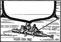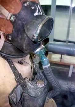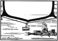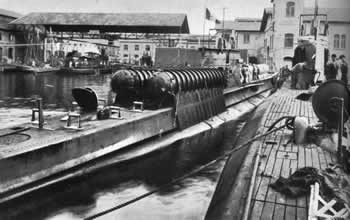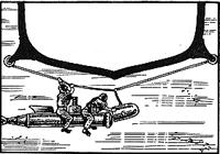 Formaba parte del equipo unos alicates especiales para cortar redes, un ingenioso dispositivo accionado por aire comprimido y destinado a levantar las redes, grapas para fijar la carga a las quillas de los buques, y un voluminoso rollo de cuerda. El piloto y su ayudante llevaban trajes de goma que los cubrian totalmente, excepto el rosto y las manos. Sus máscaras recordaban a los actuales equipos para pesca submarina y se alimentaban con botellas que contenian oxigeno a presión para seis horas. El óxido de carbono era absorbido a trabes del mismo tubo y pasaba a un depósito que contenia cristales de sosa. |