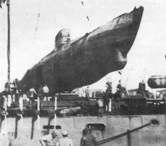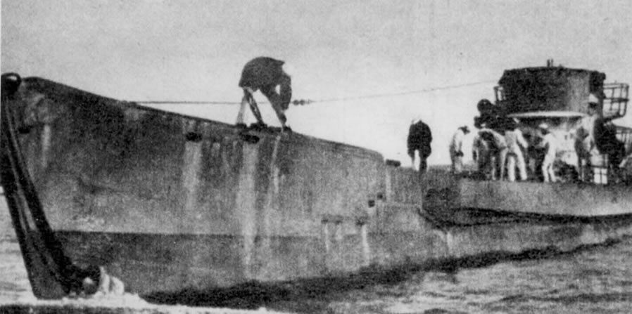 Arriba el U1406 siendo embarcado en la cubierta del "Shoemaker" |