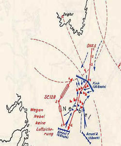 Las condiciones meteorológicas eran terribles en ese momento y los hidroaviones estaban volando en una espesa niebla a una altura de unos 15m sobre la superficie del mar. Justo en el momento en el que Peuckert estaba a punto de ordenar la vuelta a la base, vió a uno de los Bv138 que estaban siguiendo al convoy. |