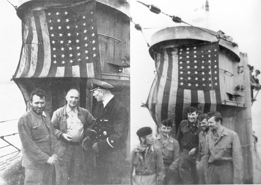 La torreta del U582 cubierta con la bandera del SS.Stella Lykes. En la imagen de la izquierda aparece el capitán del mercante S.Charles Wallace en el centro. Foto cedida por el Dr.Axel Niestlé y la información ha sido facilitada por Eric Stone. |