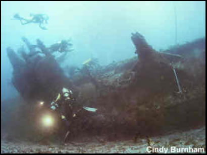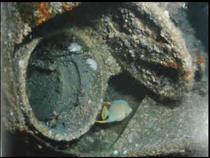 El cañón no está, posiblemente fue arrancado por las cargas de profundidad y hasta ahora no ha sido localizado por los submarinistas. En 1980 bastantes proyectiless de 88 mm., torpedos, cargas de profundidad y distintos objetos fueron recogidos de la arena por submarinistas de la U.S. Navy. Sin embargo aún existen tres torpedos a bordo. Existen muchos erizos engarzados en el acero oxidado pero casi ninguna anémona, esponja o coral. ¡Que cosa! Un golpe en el tubo del mi panel de instrumentos, un susto y enseguida vuelvo a la realidad. Es Steve, mi atento compañero. ¡La aguja del manómetro ya está en rojo y ya es hora de subir, que pena, una aventura inolvidable! |