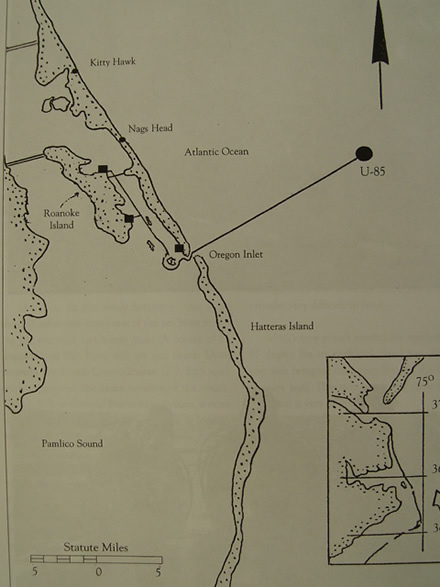 En 2003 buceé los restos del U1277, hundido por su propia tripulación en 1945, que se encuentra cerca de una playa de Oporto (Portugal). Una inmersión emocionante a 32 metros de profundidad en unas aguas heladas. En 2006 visité al U352 hundido en combate en 1942 cerca del faro de Lookout en Carolina del Norte (USA). Ese mismo año visité también el U505, una visita más fácil ya que se encuentra en el Museo de la Ciencia y la Industria (Science and Industry) de Chicago. Pero aún quedan más uboote. En 2008 inicié un nuevo proyecto y en agosto, en pleno verano americano, desembarqué en Nags Head, Carolina del Norte. Intentaría otra vez bucear los restos del U85, inmersión que tuve que anular en 2007 a causa del paso del huracán Gabrielle (2). |