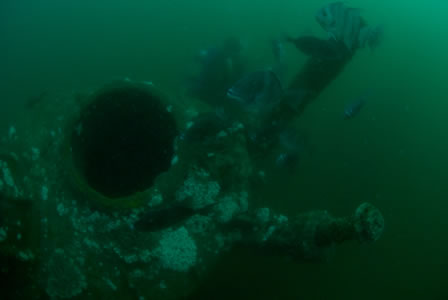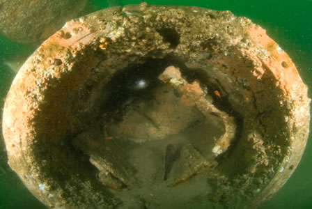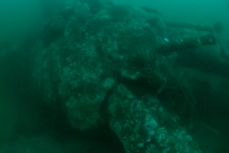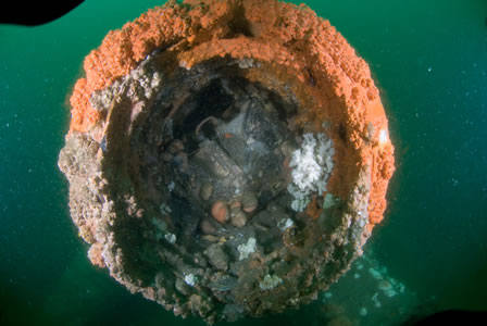 Todo él es muy fino. Un objeto capaz de cortar la línea del agua de forma bastante discreta. Busqué en vano la ametralladora antiaérea de la torreta, de calibre 20 mm, situada en la parte posterior de la misma en una plataforma conocida como el “wintergarten” (jardín de invierno). En 1942 buceadores de la US.Navy desmontaron la ametralladora y a finales de los 80 desapareció misteriosamente un torpedo, que aún se encontraba en el interior del tubo lanzatorpedos de popa. El periscópio de observación también ha desaparecido. El largo casco reposa en un fondo de arena, inclinado aproximadamente 45 grados al noreste. Nadamos lentamente, encantados por la falta de gravedad hacia el cañón de cubierta. Imaginaba que sería más grande. El tubo del cañón apunta agónicamente hacia la superficie, con un ángulo de unos 60 grados y se pueden observar perfectamente los mecanismos de elevación del mismo. Pensé en los marineros ametrallados mientras intentaban cargarlo. Es escalofriante, tanto que ni notaba el agua helada que empezaba a penetrar mi traje de 5 mm. ¡Dios mío, se destila historia por todos lados! Nadamos un poco más y llegamos a la zona de proa. Allí están los cuatro tubos lanzatorpedos, realmente sus formas son siniestras. El tubo inferior derecho, junto a la arena, se encuentra en excelentes condiciones. |