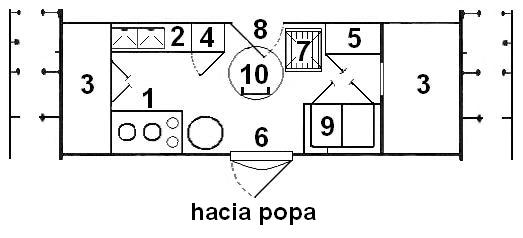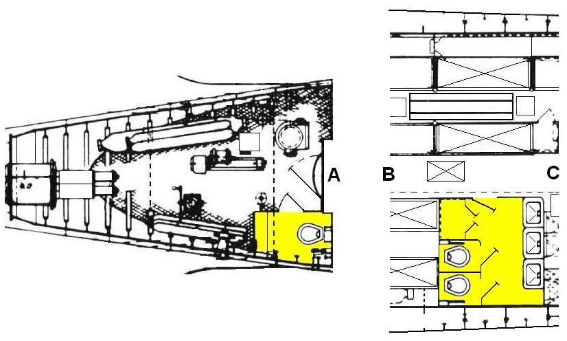 A la izquierda la sección de popa, con el aseo en la banda de estribor y a la derecha los baños de proa, en la misma banda (para mejor comprensión, ver el plano parcial del inicio del artículo). |