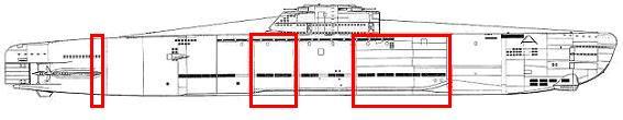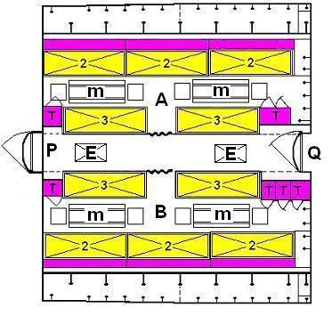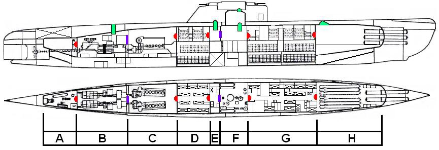 | Nota: En color rojo las literas y en naranja los acumuladores de los cuartos de baterías. | |||