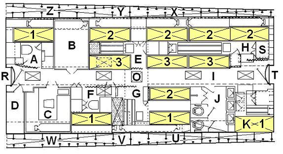 Cada compartimiento poseía un acceso central de 70 centímetros cerrado por unas cortinillas, creando dos camarotes de 6 metros de longitud y 2,20 de ancho conteniendo cada uno 12 literas, distribuidas en 5 bloques, tres de 2 pisos adosados a las bandas, y otros 2 de tres literas próximos al pasillo. |