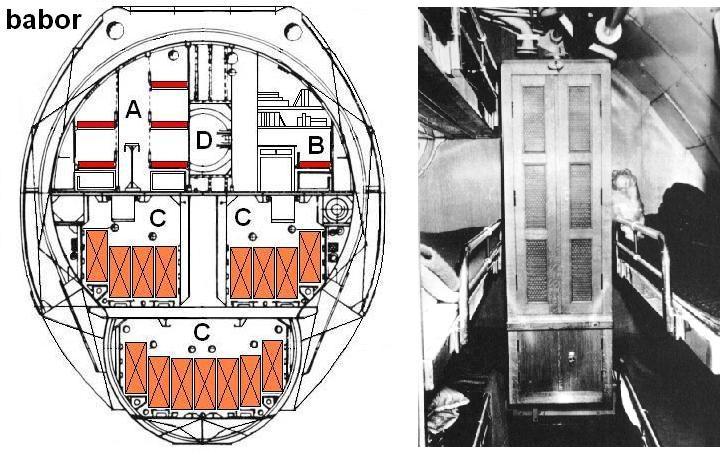 Arriba: corte vertical de la sección 6 a la altura del camarote del Oficial Ingeniero (L.I.). A la derecha camarote de babor del “Wilhelm Bauer” ex U-2540. El armario es original del tipo XXI. |