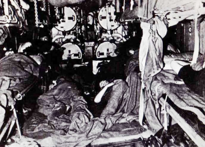 ![]() Tripulantes descansando en la sala de torpedos de un viejo sumergible. |
