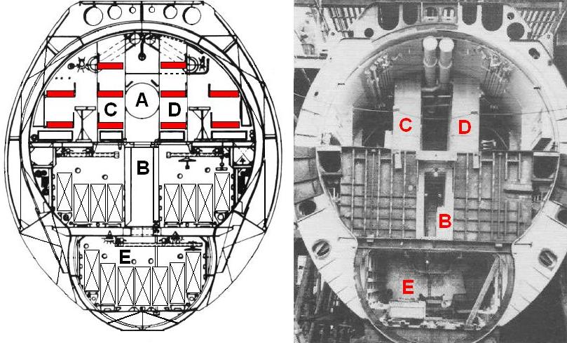 Este compartimiento se encontraba situado ocupando completamente la sección 4 del submarino, entre la cocina y el cuarto de motores térmicos, a popa de la “Zentrale”.