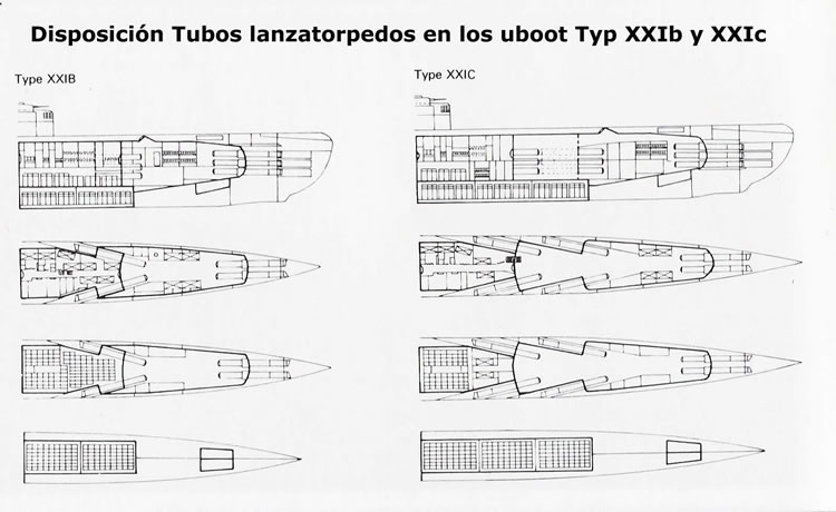 Ni que decir tiene que al tratarse de un nuevo diseño, la clase XXI se caracterizó por ser una continua fuente de mejoras y cambios en los planos. Conforme se iban botando nuevos submarinos, y tras ser asignados a unidades de prácticas, sus comandantes volvían a las bases con experiencias y problemas que los diseñadores no tardaban en corregir y cuyas modificaciones aplicaban a las siguientes unidades listas para ser comisionadas. La producción en serie de las unidades de la clase XXI (con la puesta en astillero del “U-2501” el 3 de abril de 1944, botado el 12 de mayo del mismo año y comisionado como cabeza de serie el 26 de junio de 1944) no supuso la mayoría de edad del primer submarino de la historia. El alto mando no había parado de exigir a los diseñadores nuevas variantes, cada una de ellas con misiones específicas (a saber: submarino torpedero, transporte, cisterna, etc...), bien es cierto que ninguna de ellas pasó de la fase de diseño, lo que impidió conocer su comportamiento en operaciones reales de combate. |